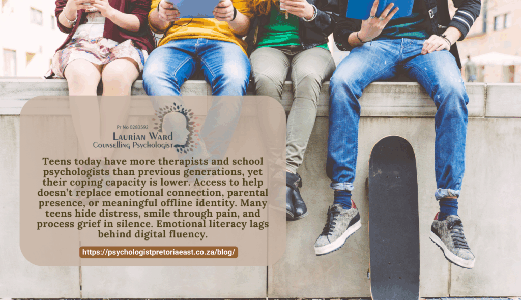 Teens today have more therapists and school psychologists than previous generations, yet their coping capacity is lower. Access to help doesn’t replace emotional connection, parental presence, or meaningful offline identity. Many teens hide distress, smile through pain, and process grief in silence. Emotional literacy lags behind digital fluency.